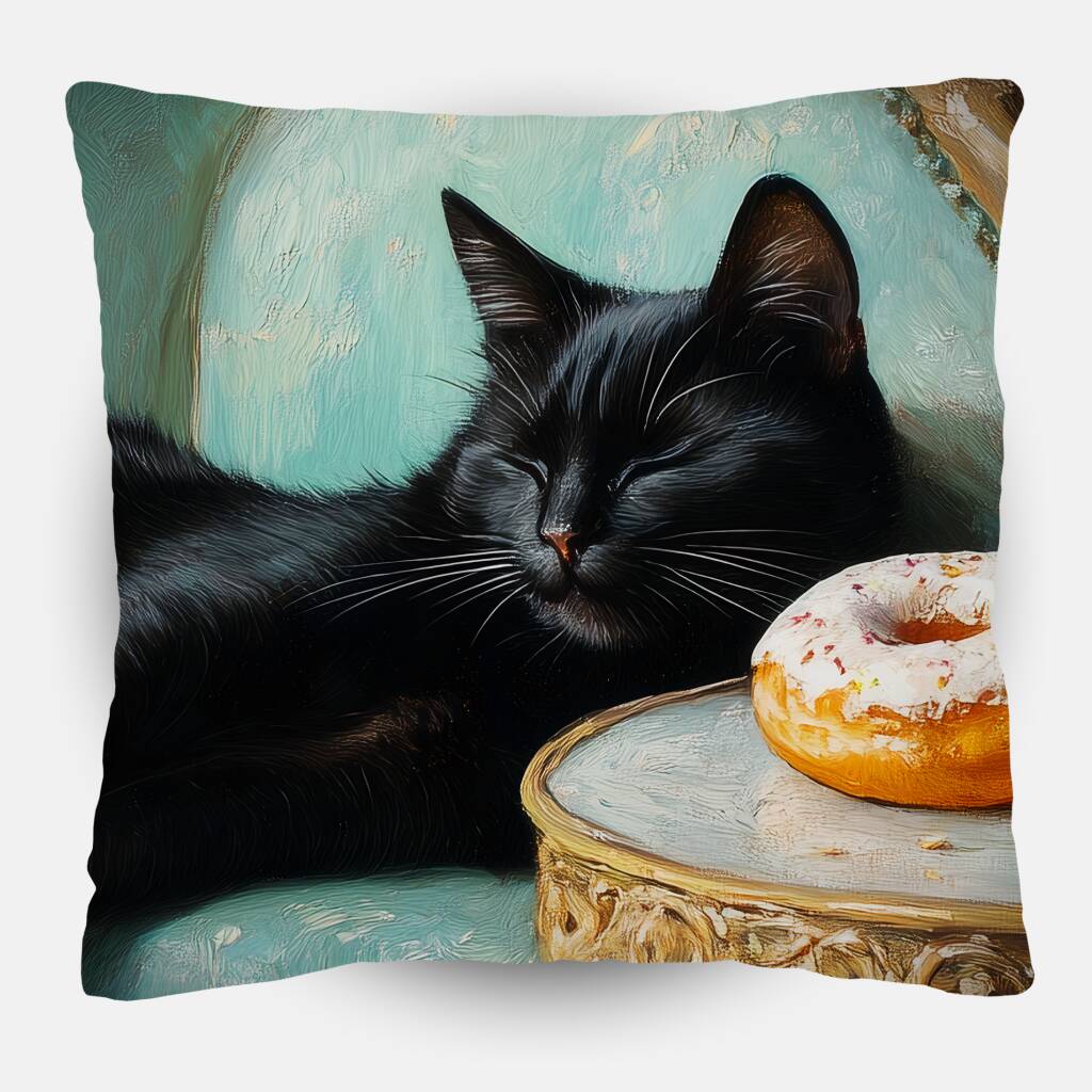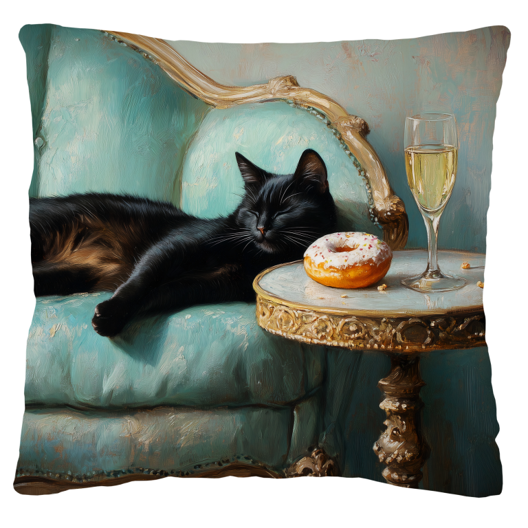 Spoiled Cat toont een charmante zwarte kat die het leven van de rijken en beroemden leeft, luxueus uitgestrekt op een antieke turquoise fauteuil met champagne en gebak binnen handbereik. De rijke texturen van het barokke meubilair en de warme vintage kleuren creëren een aristocratische sfeer vol humor en decadentie. Dit kunstwerk combineert klassieke elegantie met een speelse knipoog naar de verwende kattenlevensstijl. Perfect voor kattenliefhebbers met een voorliefde voor luxe en een vleugje humor in hun interieur.