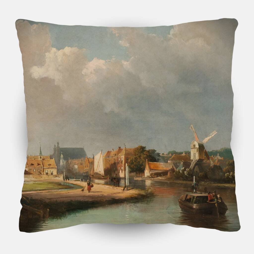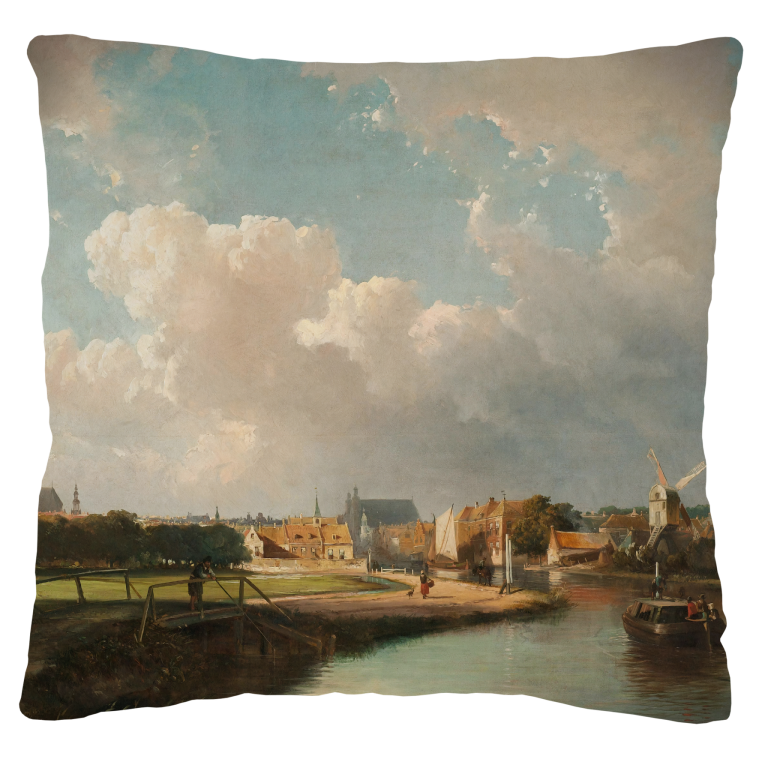 Zicht op Den Haag vanaf de Delftse Vaart toont een karakteristiek Nederlands landschap uit de Gouden Eeuw. De monumentale windmolens langs de waterweg vormen een iconisch silhouet tegen de bewolkte Hollandse lucht. In de verte zijn de torens van Den Haag zichtbaar, terwijl een trekschuit kalm over het water glijdt. Het spel van licht en schaduw op de wolken geeft dit historische tafereel een tijdloze schoonheid. De warme, gouden tinten van het zonlicht contrasteren prachtig met de koele blauwtinten van de lucht. Dit werk vangt de essentie van het Nederlandse landschap en de belangrijke rol die waterwegen speelden in het dagelijks leven en transport tussen steden. Een nostalgisch venster naar het verleden dat de grootsheid van ons cultureel erfgoed viert.